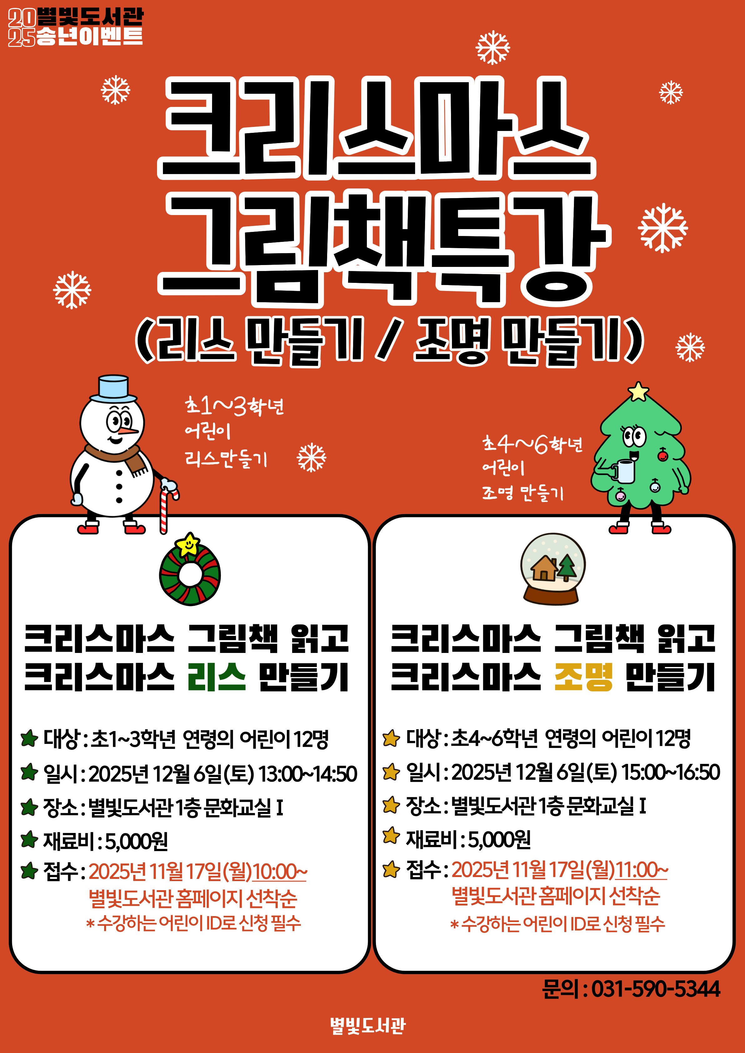 크리스마스 그림책 특강 - 리스만들기 수강할 어린이 ID로 접수 필수 크리스마스 그림책 읽고 리스 만들기 대상 : 초1~3학년 연령의 어린이 12명 일시 : 2025년 12월 6일(토) 13:00~ 14:50 장소 : 별빛도서관 1층 문화교실 Ⅰ 재료비 : 5000원 접수 : 2025년 11월 17일(월) 10사~ 문의 : 031-590-5344 *재료비 5,000원 수강생 부담입니다. 접수 후 재료비 수납 관련 안내 예정입니다. ![]() |