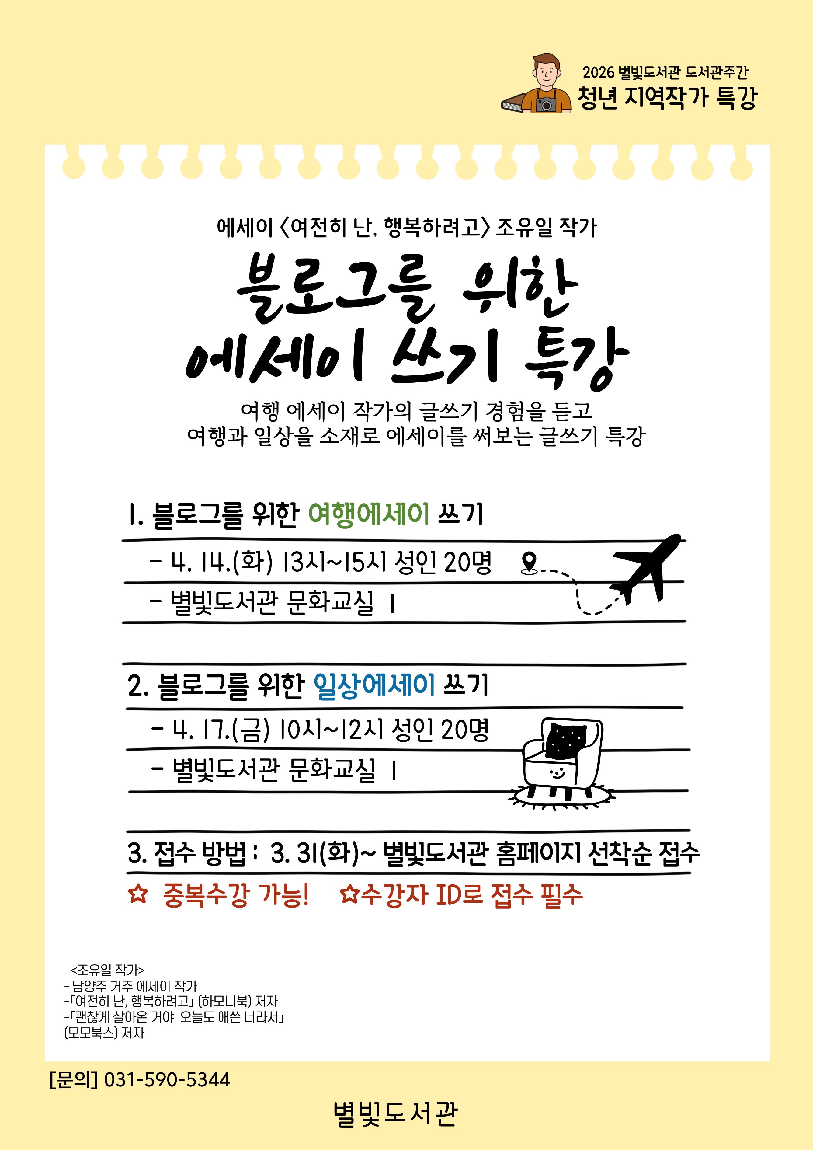 ![]() 2026 별빛도서관 도서관주간 청년 지역작가 특강 에세이 조유일 작가 블로그를 위한 에세이 쓰기 여행에세이 편 (성인 20명) 블로그를 위한 에세이 쓰기 특강 여행을 소재로 블로그에 쓸 글감을 찾고 에세이로 써내는 글쓰기 과정을 배우고 직접 실습해보는 글쓰기 수업 - 신청 수강자 ID로 접수 필수 ![]() ![]() ![]() |