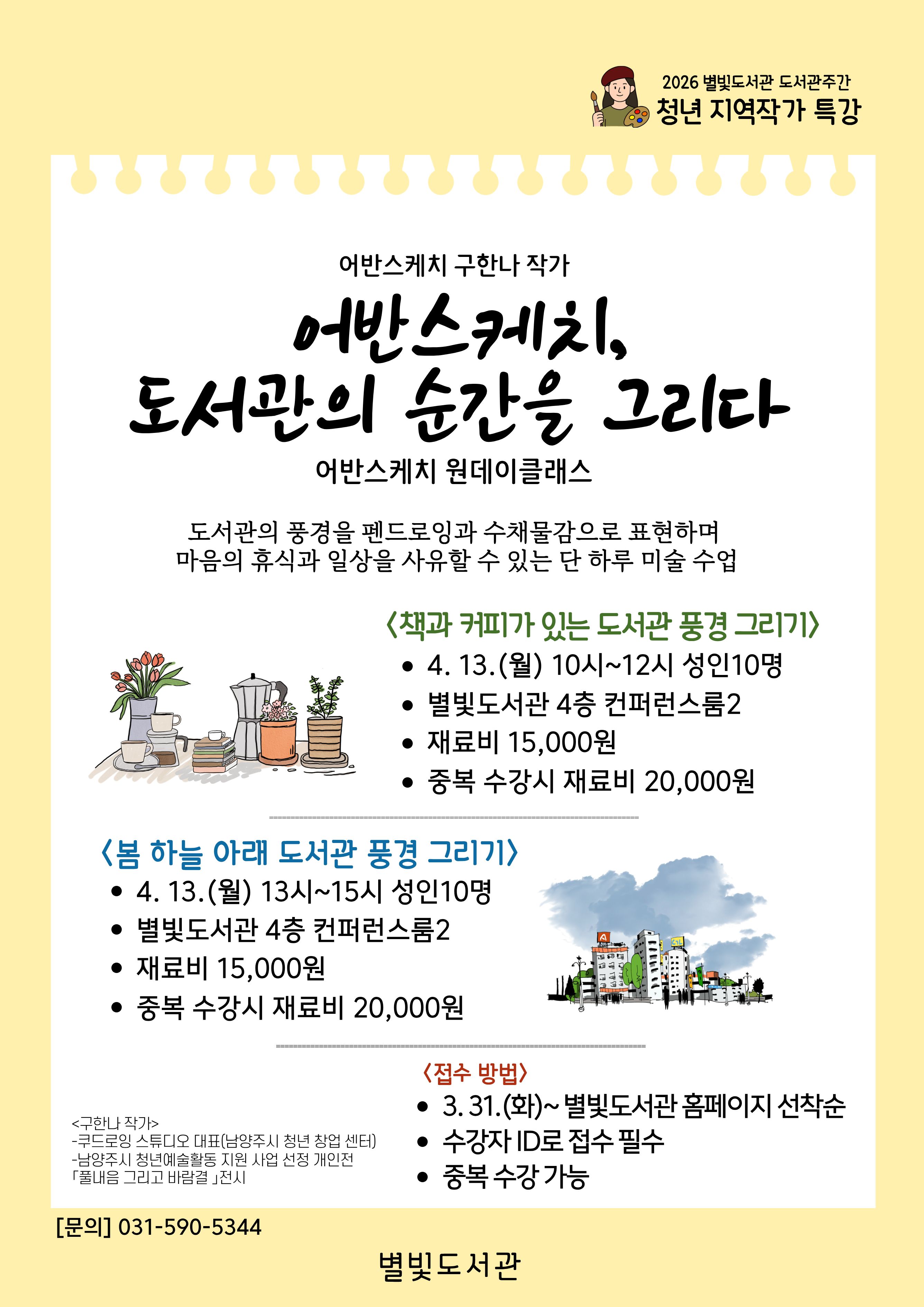 ![]() 2026 별빛도서관 도서관주간 청년 지역작가 특강 어반스케치 구한나 작가 어반스케치, 도서관의 순간을 그리다 책과 커피가 있는 도서관 풍경 (성인 10명) 펜드로잉과 수채물감 등을 이용해 도서관 공간을 예술적으로 표현해 보는 어반스케치 원데이 클래스 - 신청 수강자 ID로 접수 필수 -접수 후 재료비 관련 안내 예정 ![]() ![]() |