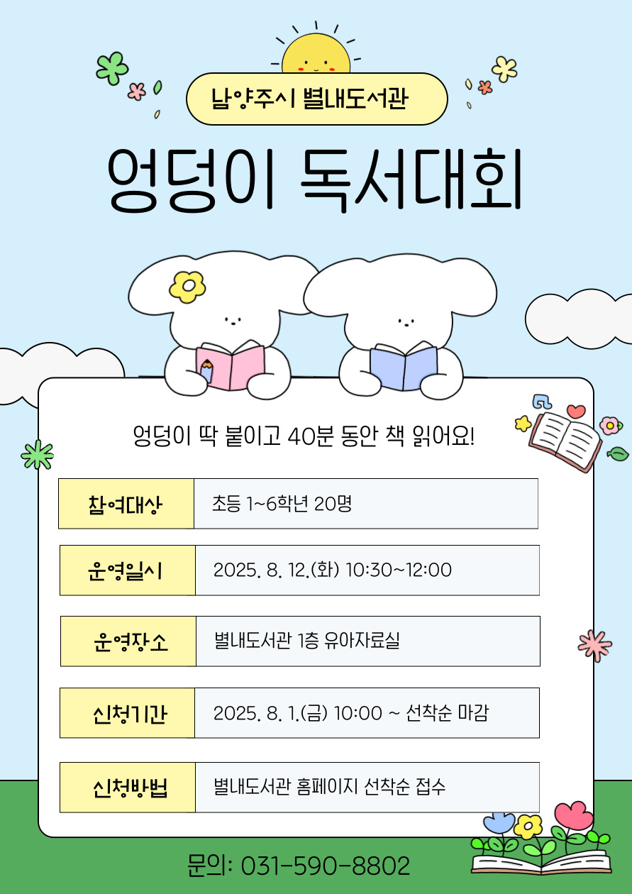 ○ 참여자 준비물: 읽고 싶은 책 (40분 동안 읽을 책), 필기 ○ 운영내용 - 40분동안 엉덩이 떼지 않고 독서 + 20분 간 독서노트 작성 - 휴대전화 X! 멍때리기 X! 엉덩이 딱 붙이고 앉아 책 읽기!! - 참여자 전원에게는 독서왕 다산 정약용 에코백을 드립니다 (숨겨진 선물도 있어요!) ○ 유의사항 - 주차공간이 협소함으로 대중교통을 이용하여 주시기 바랍니다. - 신청은 참여하는 어린이 성명/생년월일을 기재하여 신청바랍니다. - 행사 참여가 가능한 어린이들만 신청해주시기 바랍니다. ![]() |
