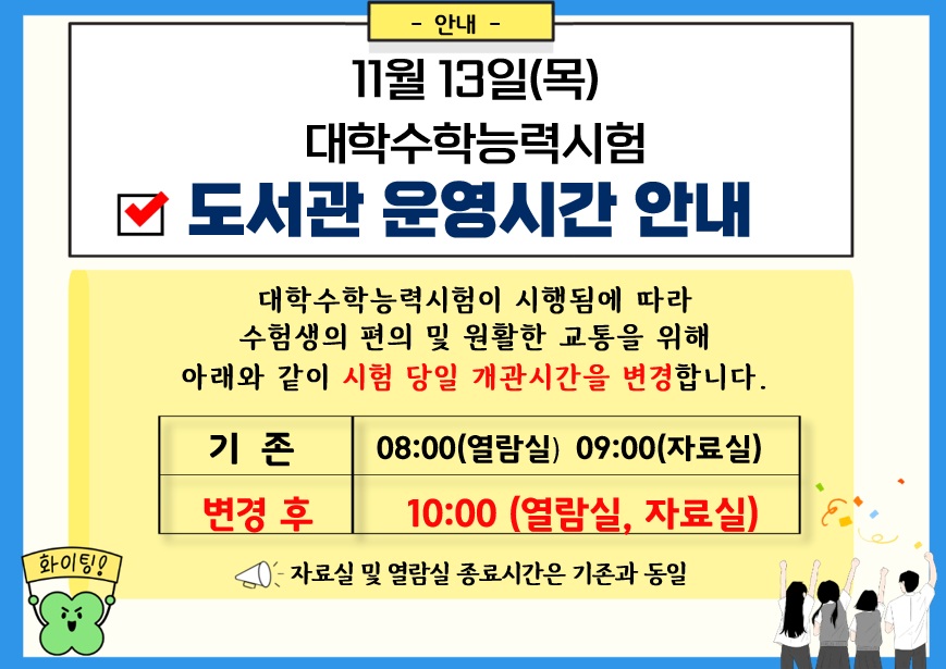 대학수학능력시험 시행일(11/13) 남양주 공공도서관 운영 시간 안내
