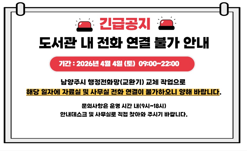 [긴급공지] 도서관 내 전화 연결 불가 안내(4. 4. 토)