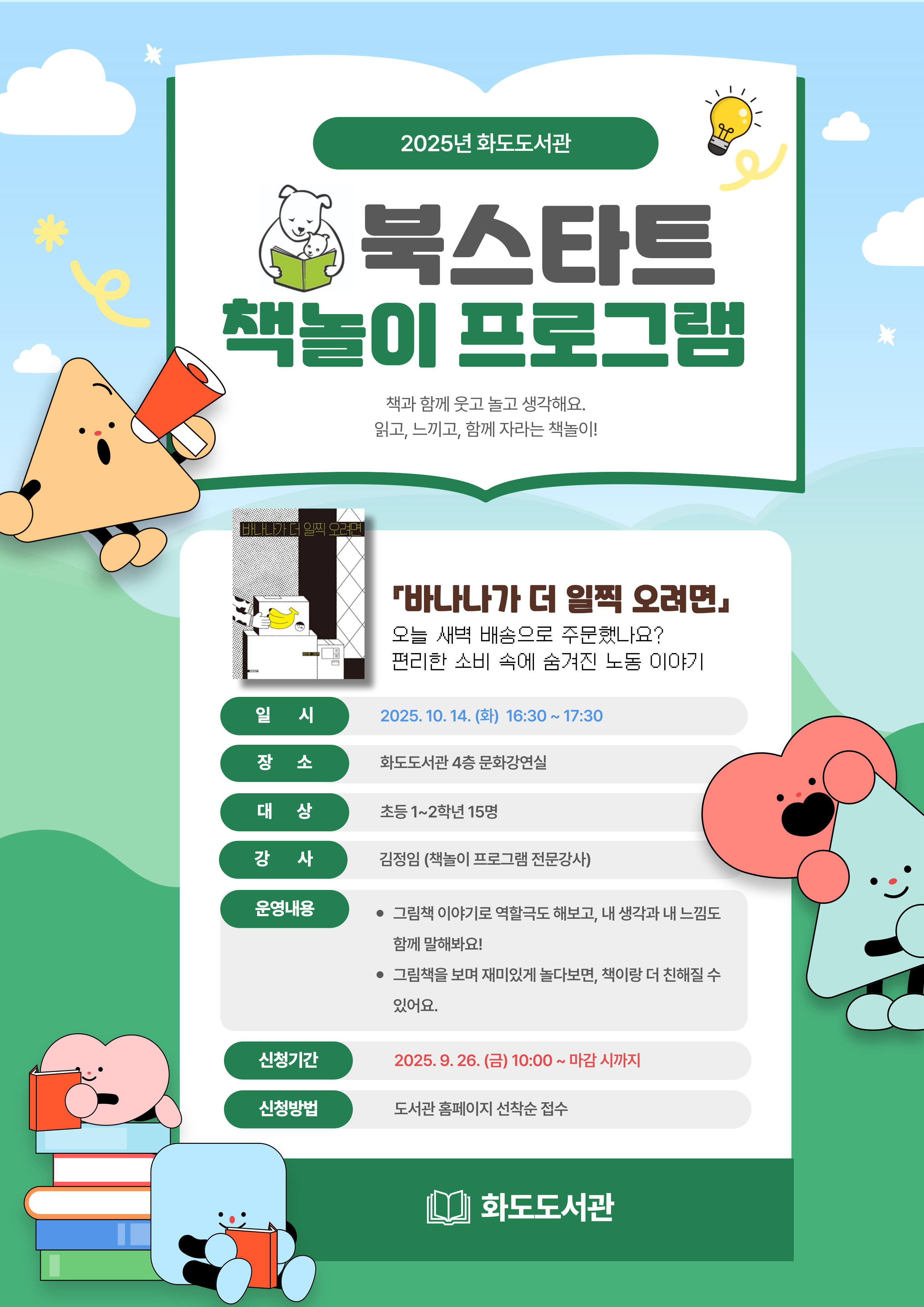 [북스타트] 북스타트 책놀이 (바나나가 더 일찍 오려면) 📌운영일시 : 2025. 10. 14. (화) 16:30~17:30 📌신청기간 : 2025. 9. 26. (금) 10:00 ~ 마감 시까지 📌강사 : 김정임 (책놀이 프로그램 전문강사) 📌운영장소 : 화도도서관 4층 문화강연실 📌모집대상 : 7세 ~ 초등 2학년 15명 (※ 모집대상 7세까지 확대) 📌운영내용 - 주제도서 : 바나나가 더 일찍 오려면 - 그림책 이야기로 역할극도 해보고, 내 생각과 느낌도 함께 말해봐요! - 그림책을 보며 재미있게 놀다보면, 책이랑 더 친해질 수 있어요. - 참여자 전원에게 북스타트 책꾸러미 제공합니다. 📢유의사항 - 수업에 대한 자세한 내용은 첨부파일의 강의계획서 참고하여 주시기 바랍니다. - 주차공간이 없으므로 도보/대중교통 또는 도서관 인근의 공영주차장을 이용해주시기 바랍니다. - 신청은 참여하는 참여자의 성명/생년월일로 기재하여 신청바랍니다. - 수업 참여 가능하신 분들만 신청주시기 바라며, 무단불참 및 당일취소 시 다음 행사 신청이 불가합니다. - 일자별 중복신청 불가, 10/14(화), 10/21(화), 10/28(화) 중 참여를 원하는 날짜를 선택하여 하루만 신청 부탁드립니다.