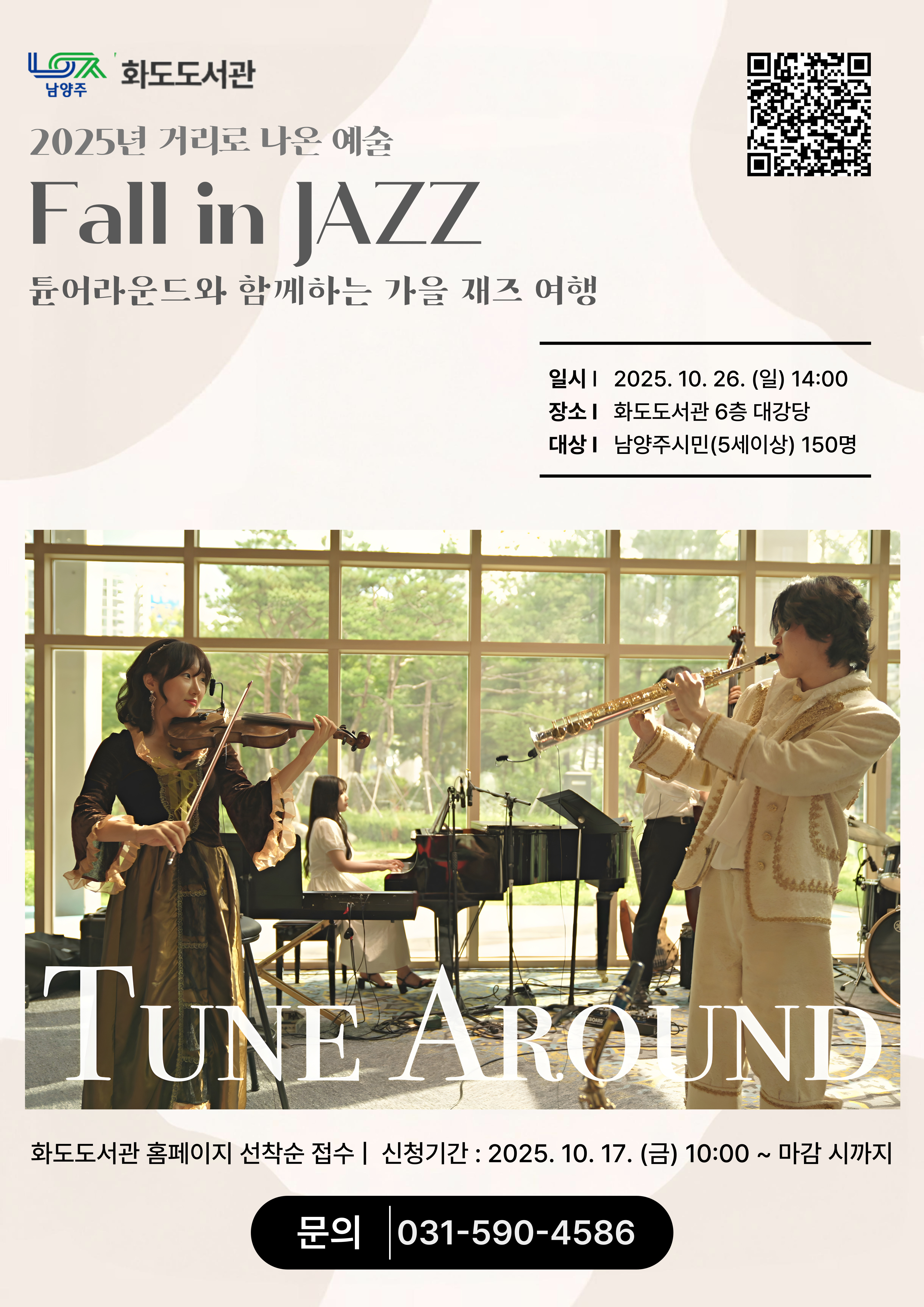 [거리로나온예술] Fall in JAZZ (튠어라운드와 함께한 가을 재즈 여행) 📌운영일시 : 2025. 10. 26. (일) 14:00 ~ 15:00 📌신청기간 : 2025. 10. 17. (금) 10:00 ~ 마감 시까지 📌공연팀 : Tune Around(튠어라운드) 📌운영장소 : 화도도서관 6층 대강당 📌모집대상 : 남양주시민(5세이상) 150명 📌운영내용 - 바이올린과 색소폰이 중심이 되어, 누구나 익숙한 대중가요·영화OST·클래식 선율을 재즈로 새롭게 해석한 무대 - 공연 중간에는 재즈 감상법과 박수 치는 방법을 소개하며, 연주자들이 객석으로 직접 내려가 관객과 소통하는 등 참여와 교감이 살아있는 공연 - 공연 프로그램 구성 내용은 첨부파일에서 확인해 주시기 바라며, 프로그램 구성은 현장 상황에 따라 일부 변동될 수 있습니다. 📢유의사항 - 동반인원 최대 5명까지 신청 가능합니다. - 주차공간이 없으므로 도보/대중교통 또는 도서관 인근의 공영주차장을 이용해주시기 바랍니다. - 신청은 참여하는 참여자의 성명/생년월일로 기재하여 신청바랍니다. - 행사 참여가 가능하신 분들만 신청주시기 바라며, 무단불참 및 당일취소 시 다음 행사 신청이 불가합니다. 대기신청 해주시는 분들을 위해서라도 꼭 참여 가능한 분들만 신청주시기 바랍니다. ![]() |