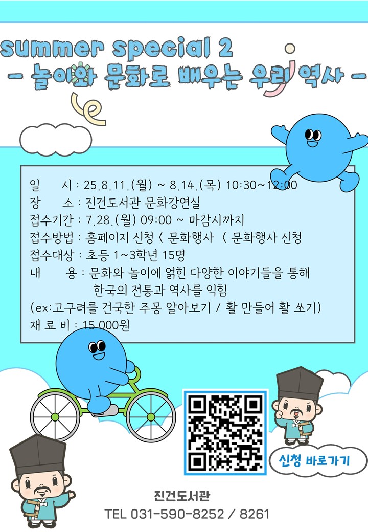 ![]() ○ 프로그램명 : 놀이와 문화로 배우는 우리 역사 ※ 수업에 대한 상세한 내용은 첨부파일의 강의계획서를 참고해주세요.