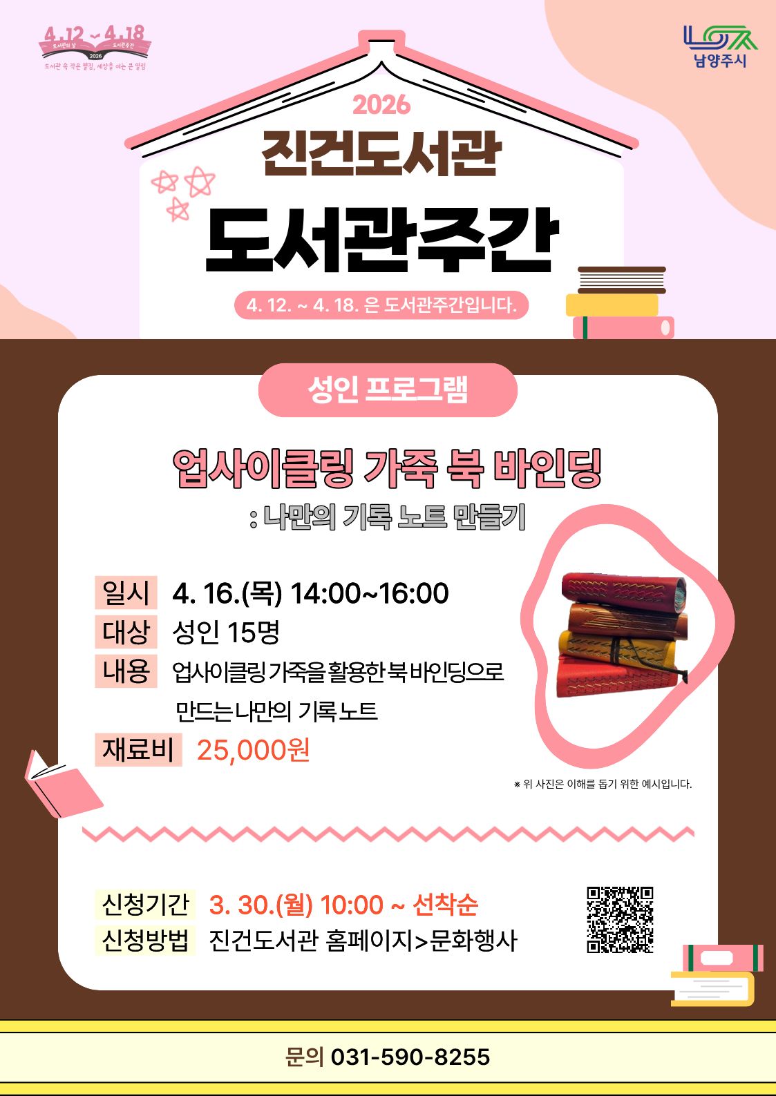 📚 (성인 프로그램)업사이클링 가죽 북 바인딩 : 나만의 기록노트 만들기 ○ 운영기간 : 4. 16.(목) 14:00~16:00 ○ 운영대상 : 성인 15명 ○ 운영내용 : 업사이클링 가죽, 실과 종이를 사용하여 직접 엮는 제본방식으로 만드는 나만의 기록노트 ○ 재 료 비 : 25,000원 ※ 진건도서관 주차장은 매우 협소하므로 대중교통을 이용하시거나 인근 공영주차장을 이용해주세요. ※ 당일 노쇼는 다음 행사 참여에 제한이 있을 수 있으니 반드시 참여하실 분만 신청해주시기 바랍니다. ※ 수업 중 행사 결과보고를 위한 사진촬영이 있을 수 있습니다. ![]() |