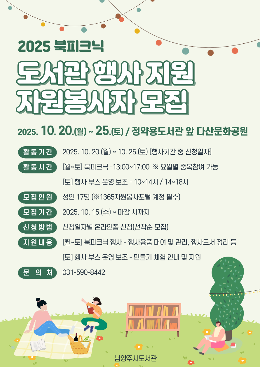남양주시도서관에서는 시민과 함께하는 2025 북피크닉 : 다산과 함께 놀며 책읽장(場)의 원활한 운영을 위해 자원봉사자를 모집합니다. 독서와 문화, 예술이 어우러진 북피크닉 현장에서 여러분의 따뜻한 참여를 기다립니다! ○ 활동기간 : 2025. 10. 20.(월)~ 10. 25.(토) ○ 활동조건 : 성인 / 1365 자원봉사포털 계정 필수 ○ 활동내용 및 일정 ※ 일자별 개별 신청 / 중복 신청 가능 / 선착순 자동 마감 - 북피크닉 행사 운영 보조(행사용품 대여 및 관리, 행사도서 정리 등) ① 10.20.(월) 13:00~17:00(4시간) - 2명 ▶ 신청 바로가기 ◀ ② 10.21.(화) 13:00~17:00(4시간) - 2명 ▶ 신청 바로가기 ◀ ③ 10.22.(수) 13:00~17:00(4시간) - 2명 ▶ 신청 바로가기 ◀ ④ 10.23.(목) 13:00~17:00(4시간) - 2명 ▶ 신청 바로가기 ◀ ⑤ 10.24.(금) 13:00~17:00(4시간) - 2명 ▶ 신청 바로가기 ◀ ⑥ 10.25.(토) 13:00~17:00(4시간) - 2명 ▶ 신청 바로가기 ◀ - 북피크닉 행사 부스 운영 보조(만들기 체험 안내 및 지원) ① 10.25.(토) 10:00~14:00(4시간) - 1명 / 대학생 ▶ 신청 바로가기 ◀ ② 10.25.(토) 14:00~18:00(4시간) - 1명 / 대학생 ▶ 신청 바로가기 ◀ ○ 문의사항 : 031-590-8442 ![]() |