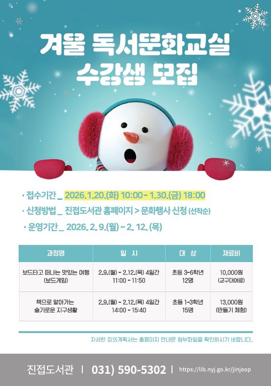 진접도서관 [겨울 독서문화프로그램] 수강생 모집 - 신청기간 : 2026. 1. 20.(화) 10:00 ~ 1. 30.(금) 18:00 - 신청방법 : 진접도서관 홈페이지 선착순 (https://lib.nyj.go.kr/jinjeop/index.do) - 운영기간 : 2026. 2. 9.(월) ~ 2. 12.(목) - 참가대상 : 초등1~6학년(프로그램 별 상이) - 재 료 비 : 접수 후 문자로 개별 안내 예정입니다.