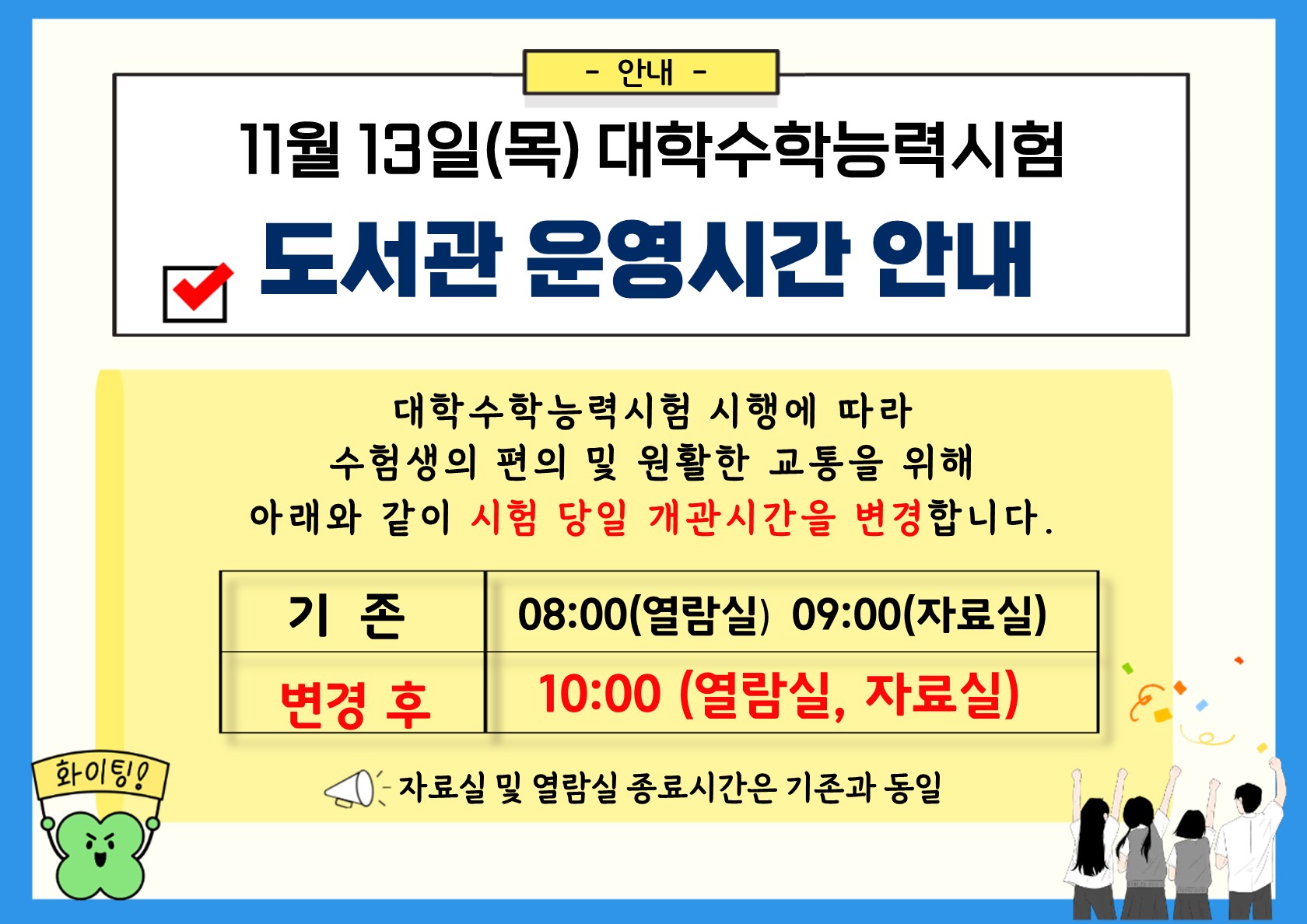 2025년도 대학수학능력시험이 11월 13일(목)에 시행됨에 따라 수험생의 편의 및 원활한 교통 소통을 위하여 아래와 같이 남양주시 공공도서관 운영시간을 조정합니다. 도서관 이용에 참고하여 주시기 바랍니다. - 일 자 : 2025. 11. 13.(목) - 대 상 : 남양주시 전체 공공도서관 - 조정사항 : 오전 10:00시 개관 (종료시간은 기존과 동일) ![]() |