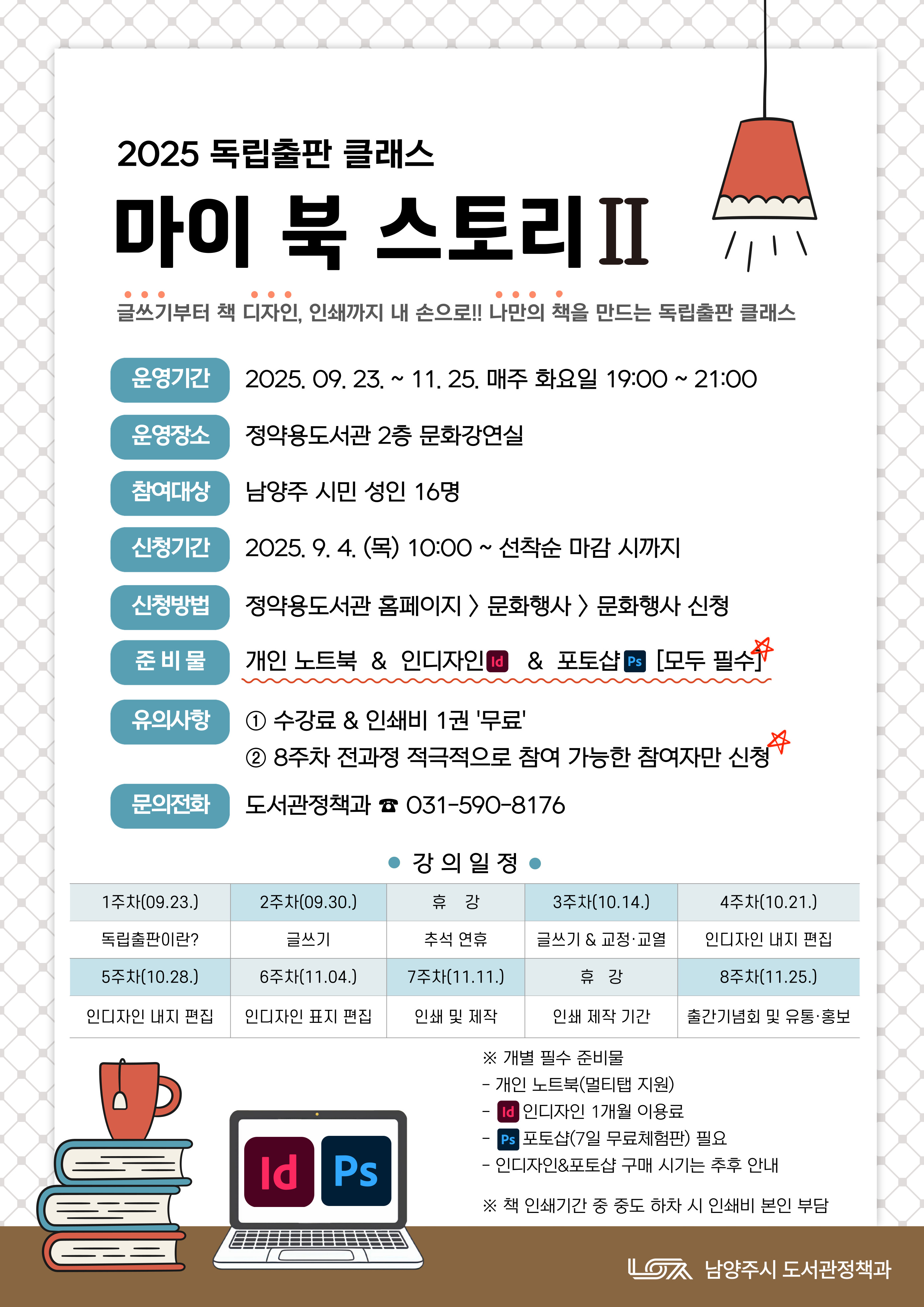 - 수강에 관련된 준비물은 수강생 부담으로 진행됩니다. (개인 노트북+인디자인+포토샵)