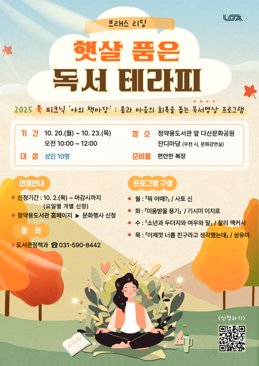 가을 햇살을 머금은 2025 북피크닉 야외 책마당, ‘독서명상’과 함께하는 힐링의 시간! 책과 호흡이 어우러지는 시간을 통해 지친 몸과 마음을 다독이며 따뜻한 에너지를 가득 채워 보세요! 청명한 가을 하늘 아래, 책과 함께 온전한 나를 만날 수 있는 색다른 독서체험을 경험해보시기 바랍니다! ※ 유의사항 ※ - 본 프로그램은 야외에서 진행되며, 우천 시에는 도서관 2층 문화강연실에서 진행합니다. (상황에 따라 변경될 수 있음) - 명상과 함께 '글쓰기-함께 이야기하며 생각을 나누는 시간(발제문)'으로 진행하며, ★해당 요일의 도서를 읽고 오시기를 권장★드립니다! - ★접수가 마감된 경우 유선으로 대기 신청이 가능하오니 이점 참고하여 주시기 바랍니다.★ ※ 문의 : 도서관정책과 031-590-8442 ![]()
