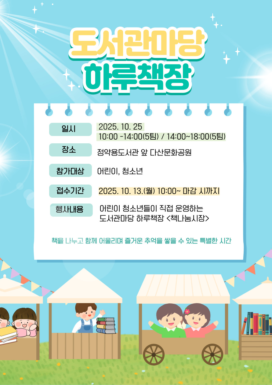 도서관 마당 하루책장 참가자 모집 안내 도서관 앞 마당에서 열리는 하루책장 벼룩시장에 어린이, 청소년 참가자를 모집합니다.! 행사 일정 -일시 : 2025년 10월 25일(토) -시간 : 1부/10:00~14:00 (5팀) 2부/14:00~18:00(5팀) 신청 안내 -신청 기간 : 10월 13일(월) 오전 10시부터 선착순 접수 -신청 방법 : 홈페이지 접수 -유의 사항 : 반드시 행사에 참가 가능한 어린이, 청소년만 신청해주세요. 행사 특징 -어린이가 직접 주도하는 책 교환 벼룩시장 -가족, 친구와 함께 즐기는 도서관 마당 체험 -나만의 책을 소개하고 교환하는 재미와 성취감 *도서관 마당에서 열리는 하루책장 벼룩시장! 아이들이 책을 나누고 함께 어울리며 즐거운 추억을 쌓을 수 있는 특별한 시간에 많은 신청 바랍니다. ![]() |