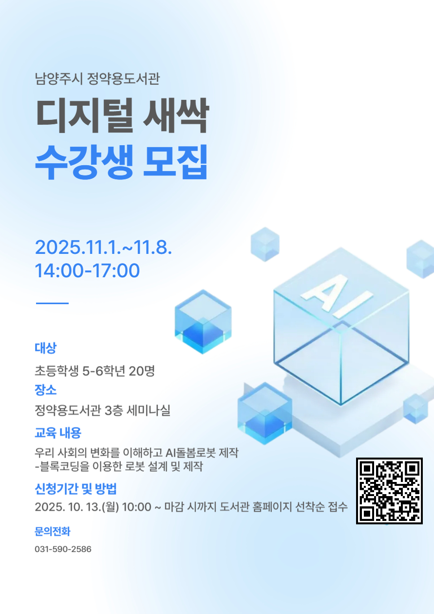 [디지털새싹]AI Together:Iot키트와 함께하는 나만의 돌봄로봇 만들기 운영기간 : 2025. 11. 1.~ 11. 8. 매주(토)14:00~17:00 [2회] 신청기간 : 2025. 10. 18.(월) 10:00~마감 시까지 운영장소 : 정약용도서관 3층 세미나실 모집대상 : 초등5~6학년 20명 운영내용 : -고령화/1인가구 증가, 디지털 전환 등 변화된 생활모습을 살펴보고 이해하기 -블록코딩과 Iot키트를 활용하여 맞춤형 AI돌봄로봇을 구현하기 위한 알고리즘 설계 -Iot키트를 살펴보고, 적절한 센서를 활용하여 맞춤형 돌봄로봇 완성 -생성형 AI를 활용하여 홍보자료를 만들고 결과물을 친구들과 함께 공유 유의사항 -수업에 대한 자세한 내용은 첨부파일의 강의계획서 참고하여 주시기 바랍니다. -주차공간이 없으므로 도보/대중교통을 이용해주시기 바랍니다. -신청은 참여하는 참여자의 성명/생년월일로 기재하여 신청바랍니다. -수업 참여 가능하신 분들만 신청주시기 바라며, 무단 불참 및 당일취소 시 다음 행사 신청이 불가합니다.