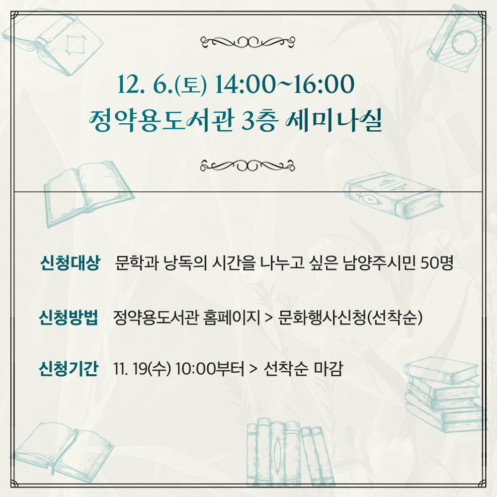 | 대상/연령제한 | 문학과 낭독의 시간을 나누고 싶은 성인 50명 |