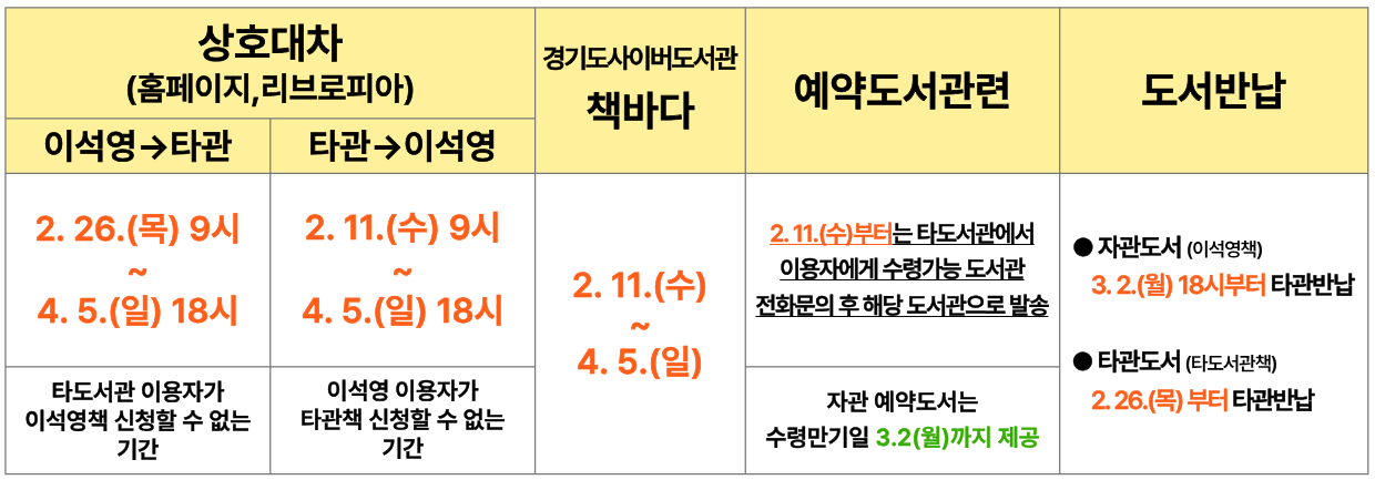 ★ 임시휴관안내 ★ 이석영뉴미디어도서관 내부 시설 환경 개선을 위한 전층/다공간 복합 공사로 인해, 임시휴관을 실시합니다. 이용객 안전 확보를 위한 조치이오니 양해 부탁드립니다. - 공사범위 : 1층 계단존(조명공사), 2층 이야기방(리모델링), 3층 컨퍼런스룸(방음공사), 4층 공간(리모델링 및 방음공사), 주차장(시설개선) 등 - 전면 휴관에 따라 도서관 출입이 제한되며, 각종 서비스가 중단될 예정이오니 이용에 참고하여 주시기 바랍니다. ※ 중단 서비스 : 도서열람/대출/반납, 상호대차, 도서예약, 국가상호대차(책바다/두루두루/내첫도), 대관, 자원봉사, 주차장 이용, 카페 이용 등 ● 휴관기간 : 2026. 3. 3.(화) ~ 4. 5.(일) ● 재개관일 : 2026. 4. 6.(월) 예정 ※ 휴관기간 및 재개관일은 공사일정에 따라 변동될 수 있습니다. ★ 도서대출서비스 이용안내 ★ ● 무인반납기, 무인반납함 운영중단 - 무인반납기 : 3. 2.(월) 18시부터 운영중단 / 무인반납함 : 2. 26.(목) 9시부터 운영중단 ● 자관도서 대출·반납 (이석영책, 자관예약도서포함) - 3. 2.(월) 18시까지 각층 자료실 데스크에서 대출·반납 가능 / 이후부터 남양주시 12개 타도서관에서 반납 가능 ※ 자관도서(이석영책) 반납예정일이 휴관기간 중인 경우, 반납일은 자동연장(휴관종료일 다음날) 됩니다. - 연체도서 제외 / 타도서관책은 반납예정일이 휴관기간 중이라도 자동연장되지 않습니다. ● 타관도서 반납 (타도서관책, 상호대차·타관예약도서포함) - 2. 25.(수) 22시까지 각층 자료실 데스크에서 반납 가능 / 2. 26.(목)부터 남양주시 12개 타도서관에서 반납 가능 ● 도서대출서비스 중단안내 ![]() |
