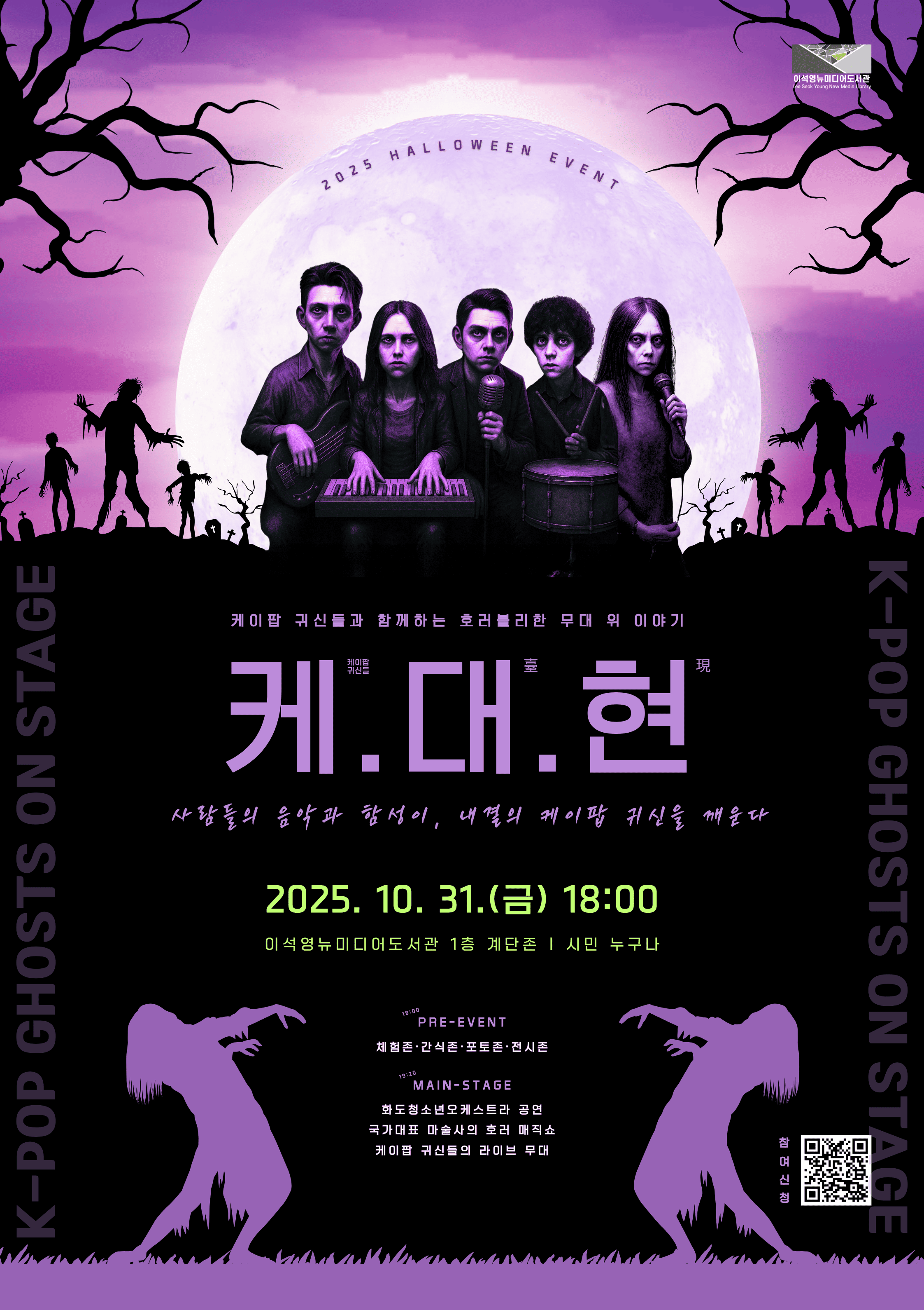 [독서문화행사] 2025 이석영뉴미디어도서관 Halloween Event "사람들의 음악과 함성이, 내 곁의 케이팝 귀신을 깨운다" 케이팝 귀신들과 함께하는 호러블리한 무대 위 이야기 케. 대臺.현現 "케이팝 귀신들이 무대 위에 나타났다!" ● 일 시 : 2025. 10. 31.(금) 저녁 PRE-EVENT / 18:00~19:10 MAIN-STAGE / 19:20~20:40 ● 대 상 : 시민 누구나 ● 장 소 : 이석영뉴미디어도서관 1층 계단존 ● 프로그램 ※운영상황에 따라 운영시간 조정될 수 있습니다. ★ [18:00~19:10] PRE-EVENT - 체험존, 간식존, 포토존, 전시존 ★ [19:20~20:40] MAIN-STAGE (19:20~19:35) 남양주시 화도청소년오케스트라 오프닝 연주 * I wil follow him (J.W. Stole, Del Roma) * Soda Pop (K-Pop Demon Hunters Ost) * Golden (K-Pop Demon Hunters Ost) * Can Can (Jaques Offenbach - Orpeus in the underworld 中) (19:40~19:50) Special Stage I (19:50~20:20) 호러 매직쇼 (공포 마술 공연) * 국가대표 마술사 최이안(SBS - 더 매직스타 출연)의 스토리가 있는 호러 매직쇼 (20:25~20:40) Special Stage II ★ 참여자 안내사항(필독) ★ 홈페이지 사전신청자는 PRE-EVENT 운영시간 중 18:30~19:00 사이 간식 받으실 수 있습니다. (18:30~19:00사이에만 수령가능) ※ 간식은 계단존에서 공연을 관람하시며 자유롭게 드실 수 있습니다. ● 참 가 비 : 무료 ![]() ![]() |