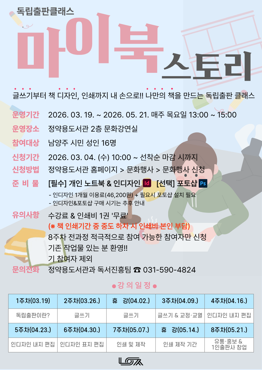 내가 쓴 글이 책이 되고 출판까지 되는 독립출판의 전과정을 배워보는 시간! 글감은 무궁무진! 일상 기록을 모아 한 권의 에세이를, 나만의 직장, 육아 생활 꿀팁만을 모아 한 권의 비법서를, 일러스트, 캘리그라피, 사진 등으로 한 권의 작품집을 만들 수 있습니다! 꾸미출판의 이지은 작가님과 함께 8주 동안 "나만의 책 만들기" 과정을 함께해 보세요! ※ 문의사항 : 정약용도서관과 031-590-4824 >>문화행사 신청 바로가기<<