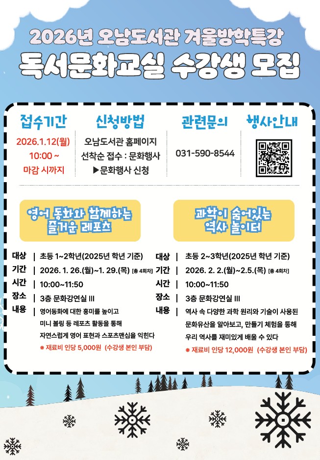 ![]() 1. 운영기간 : 1.26.(월) ~ 1.29.(목) [총 4회차] 2. 운영시간: 10:00~11:50 3. 운영대상: 초등1~2학년 [2025년 학년 기준입니다. 2026년 기준으로는 2~3학년] 4. 내용: 영어동화에 대한 흥미를 높이고 레포츠 활동을 통해 자연스럽게 영어 표현과 스포츠 맨십을 익힌다. (함께 영어 동화를 읽은 뒤, 미니 레포츠 (풍선으로 하는 배구게임, 미니 볼링 등)을 간단히 체험해 볼 예정입니다) 5. 재료비 : 인당 5,000원 (강사님 계좌로 직접 납부 안내 예정) |