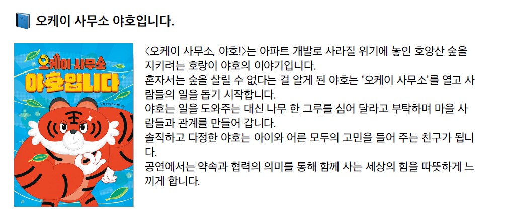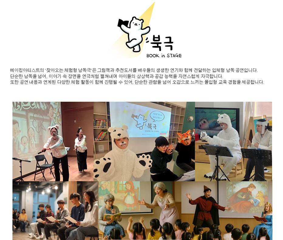 <신청 시 유의사항> ※ 해당 프로그램은 가족 동반 프로그램입니다. (* 권장연령: 초등 저학년) ※ 1개 아이디로 동반인원을 포함한 신청이 가능합니다. (신청정보 입력 시 동반인원 수 선택 필수!!!) - 예시) 가족 4명일 경우, 동반인원 3명 신청 → 신청자 본인 포함 4명 신청 완료 (동반인원은 신청자 본인 미포함) ※ 정보 입력 시 비고란에 신청자 외 동반인원의 이름 및 생년월일을 기재 바랍니다. ※ 신청 승인 문자가 별도로 공지될 예정이오니, 연락처 기재 확인 바랍니다. ※ 주차공간이 협소하오니 도보 및 대중교통 또는 인근 공영주차장을 이용하여 주시기 바랍니다. ![]() ※ 공연 예정 도서 ![]() |