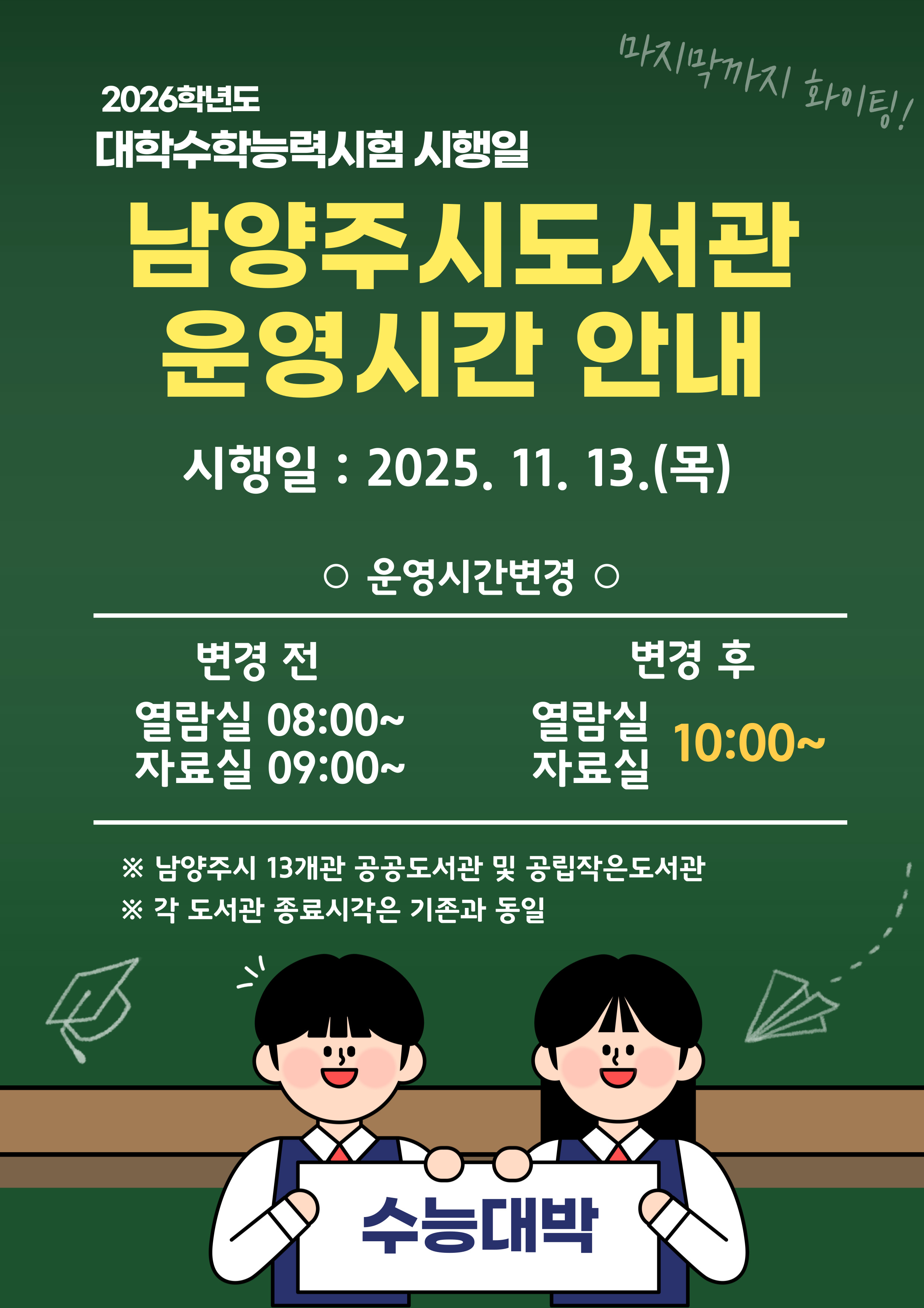 11월 13일(목) 대학수학능력시험이 시행됨에 따라, 수험생의 편의 및 원활한 교통 소통을 위해 아래와 같이 남양주 공공도서관 운영시간을 변경합니다. 도서관 이용에 참고하여주시기 바랍니다. - 일자 : 2025. 11. 13.(목) - 대상 : 남양주시 공공도서관 12개관 - 개관시간 (기존) 09:00 (변경 후) 10:00 ※ 자료실 및 열람실 종료시간은 기존과 동일합니다.