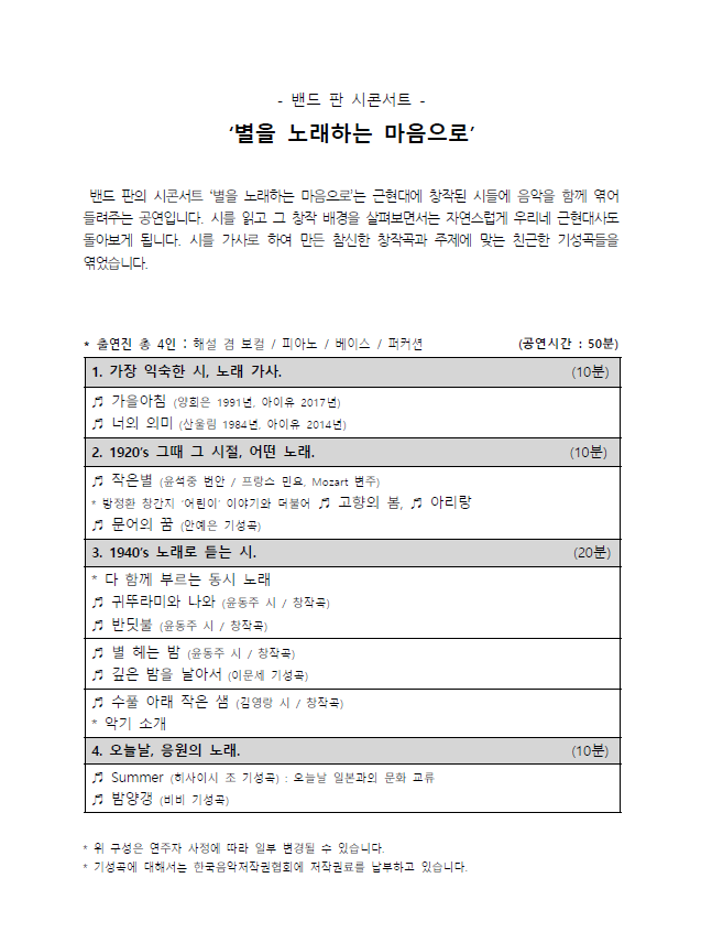 | 행사명 | 시 콘서트 <별을 노래하는 마음으로> 접수예정 |