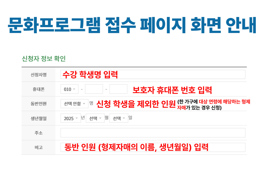 신청자명과 생년월일은 수강 학생 정보로 입력 바랍니다.(부모님 정보X) ※주차장이 협소하오니 대중교통 이용 부탁드리며, 도서관 진출입 도로는 주정차 금지구역으로 주차 시 과태료 대상임을 알려드립니다. ※한 가정에 강의 대상 학생이 두 명 이상인 경우 동반 인원을 체크 후 비고란에 신청자 외의 수강 학생명과 생년월일을 입력 바랍니다. (수강자 외 1명까지 가능) ※강의는 학생만 입장하므로 동반 인원에 부모님은 해당되지 않습니다. ![]() ![]()