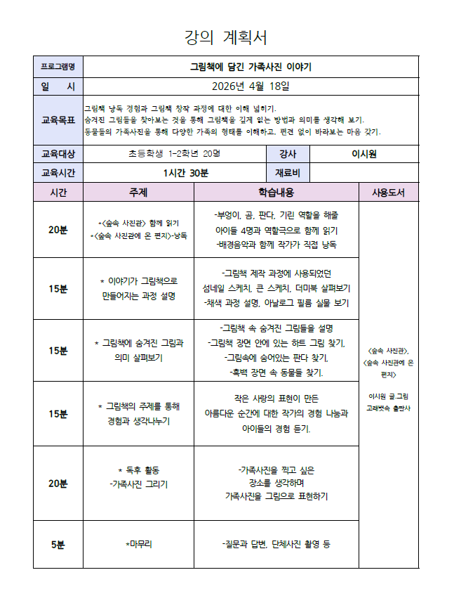 | 행사명 | 작가와의 만남 <숲속 사진관- 이시원 작가> 접수예정 |
