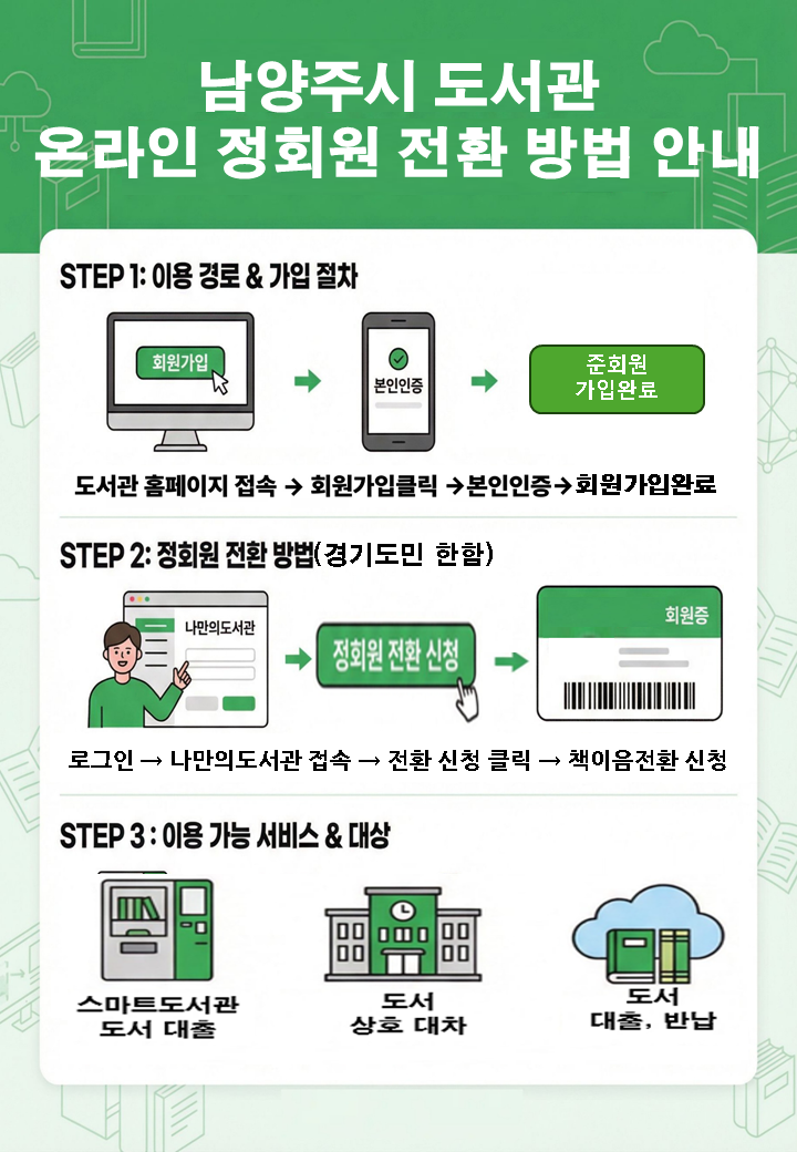 안녕하세요. 남양주시 도서관입니다. 우리 도서관은 현장 방문없이 온라인으로 정회원 신청이 가능한 회원가입 서비스를 개시합니다. 기존 -> 도서관 서비스를 자유롭게 이용할 수 있는 정회원 신청을 위해 도서관 방문 필수 변경 -> 도서관 방문 없이도 홈페이지 나만의 도서관 메뉴에서 정회원 신청 가능! Q. 정회원은 어떻게 신청하나요? 1. 홈페이지 최초 가입 시 등급은 준회원이 부여됩니다. 2. 가입 후 나만의 도서관 메뉴로 진입, 정회원 신청 버튼을 클릭해주세요!(행정안전부 시스템을 통한 본인 확인) 3. 책이음 전환 버튼까지 클릭하면 모든 절차가 완료됩니다. - 반드시 책이음 회원 전환까지 완료해야 상호대차 서비스를 이용할 수 있습니다. - 홈페이지 사용이 어려우신 분들은 가입을 희망하는 도서관에 필요한 서류(거주지가 경기도로 표기된 신분증, 등본 등)를 가지고 방문해주시기 바랍니다. Q. 정회원(책이음회원)은 어떤 서비스를 이용할 수 있나요? A. 도서관의 모든 서비스 이용 가능! - 도서 대출 및 반납, 상호대차 서비스, 희망도서 및 문화행사 신청 등 - 열람실 및 디지털자료실 등 Q. 어떤 사람들이 가입 할 수 있나요? 1. 경기도에 거주 중인 도서관 이용 희망자 2. 기존에 홈페이지 준회원 등급으로만 가입 진행 후 도서관에 방문하지 못한 이용자 - 경기도 이외 지역 거주자 중 남양주시에서 학교 또는 직장을 다니는 이용자 분들은 필요서류(재학/재직증명서)를 지참하여 도서관으로 방문해주시기 바랍니다. 감사합니다.