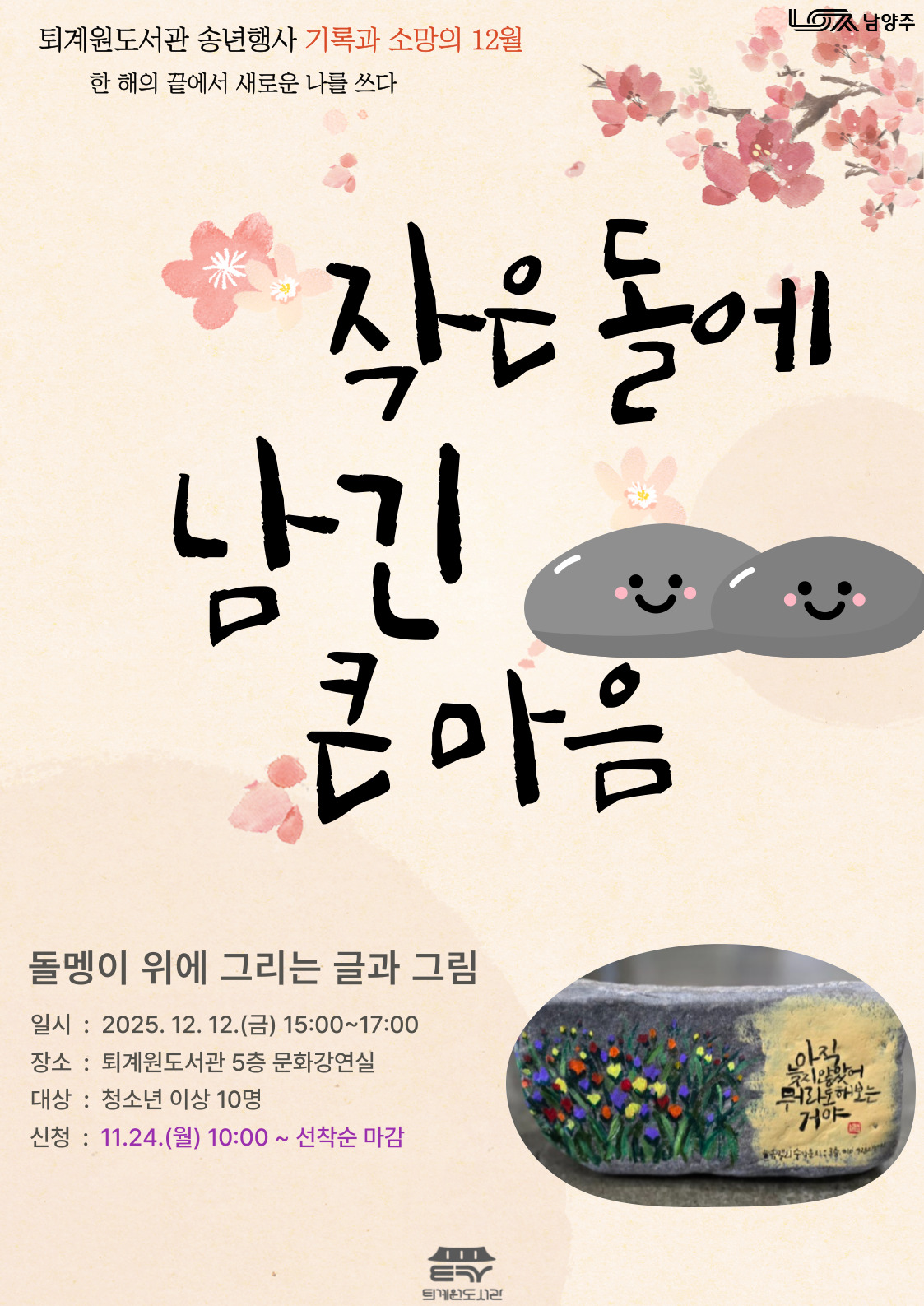 | 행사명 | [기록과 소망의 12월] 돌멩이 캘리그라피 <작은 돌에 남긴 큰 마음> 접수예정 |