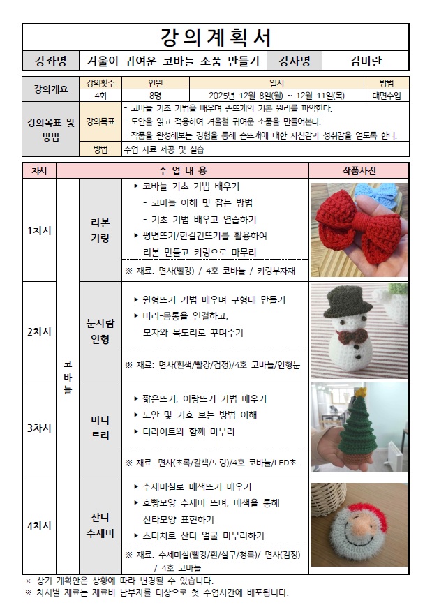 | 행사명 | (겨울)겨울이 귀여운 코바늘 소품 만들기 종료 |